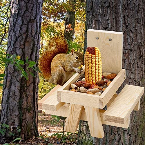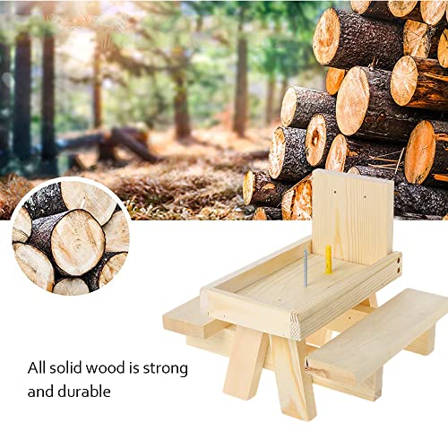Prasacco Eekhoorn Feeder Picknick Tafel met Paraplu, Maïs Cob Houder Grappig Buiten Boom of Post Mount Hek Bank Feeders voor Eekhoorns Eekhoorns, Hangende Houten Mini Picnic Tafelstoel