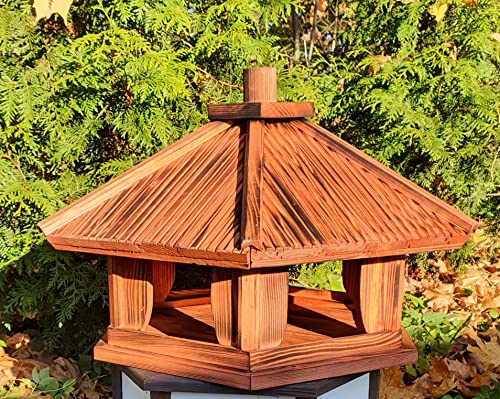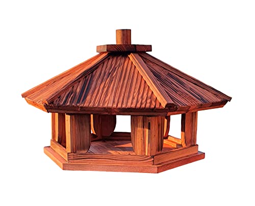 Vogelhuisje van houten vogelhuisje, vogelvoederhuisje, zeshoekig, levering is klaar gemonteerd van grenenhout. hoogte 40 cm, diameter dak 62 cm, kleur gevlamd hout + kleur els. Het mooie houten vogelhuisje is een decoratie voor terrassen, balkons of tuinen in elk seizoen. Het houten voederhuis is aan alle kanten open en biedt veel grip voor hongerige wilde vogels